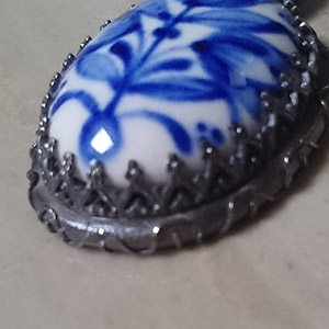 素焼きの陶器に絵付けして釉薬を掛けて本焼きした後 銀の粘土で、石座を作ったものです