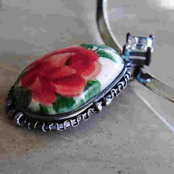 素焼きの陶器に絵付けして釉薬を掛けて本焼きした後 銀の粘土で、石座を作ったものです